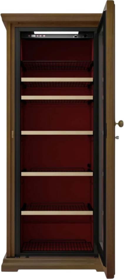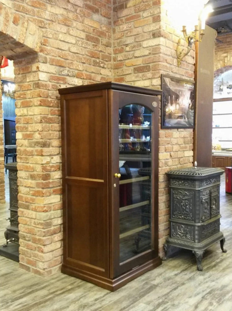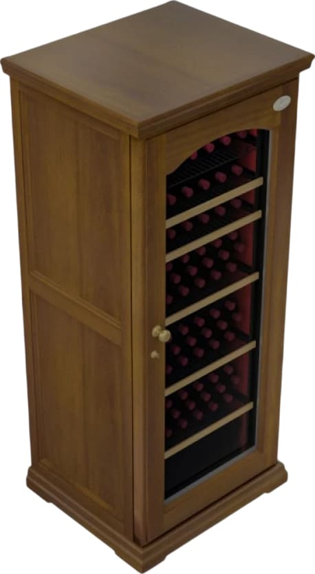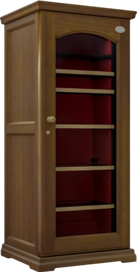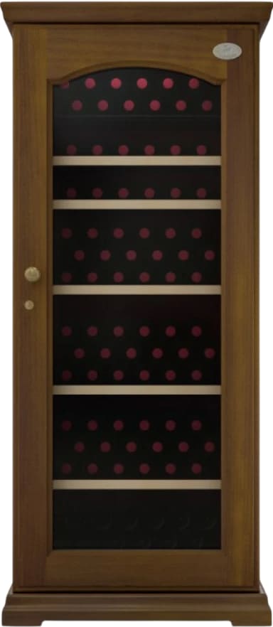 Специальное покрытие защищает вино от влияния ультрафиолетовых лучей, которые проникают, если шкаф находится в солнечной комнате. Цвет корпуса — орех.