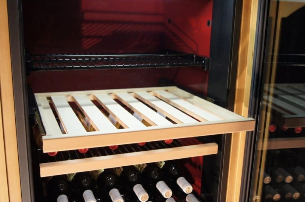Самым подходящим материалом для изготовления полок, по мнению специалистов, является натуральное не лакированное дерево — бук, дуб, сосна, лиственница. У него множество преимуществ: прежде всего оно способно гасить мелкие вибрации. Дерево хорошо поддается обработке: решетчатые полки, например, позволяют хорошо зафиксировать бутылки, так что они не будут качаться при выдвижении. Кроме того, дерево почти не впитывает запахи и при понижении температуры на нем не образуется конденсат. В некоторых моделях применяются комбинированные полки с металлическим каркасом и деревянными держателями бутылок, а также полностью металлические. Недостаток их — образование конденсата, а значит, изменение уровня влажности, которое может привести также к порче этикеток. Самый бюджетный и наименее эффектный вариант — полки из пластика, имеющие те же недостатки, что и металлические.