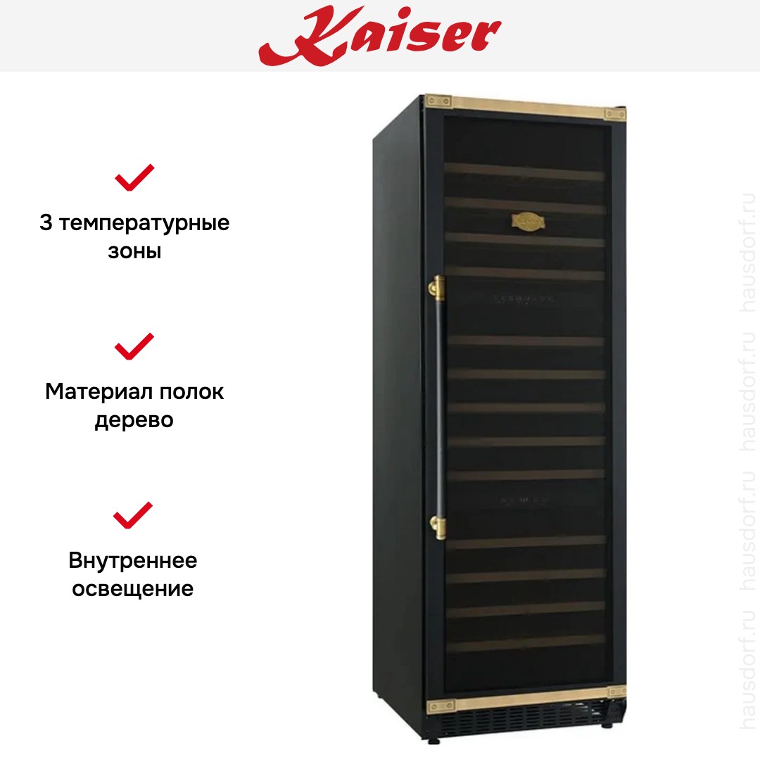 Особенность этой модели — мультитемпературная система с тремя независимыми зонами в единой камере, управляемой компрессорным охлаждением, обеспечивающим стабильность и долговечность работы. Верхний и нижний отсеки позволяют поддерживать температуру в диапазоне от 12 до 22 C, что идеально подходит для хранения красных вин, которым требуется тёплый, но не жаркий режим. Средняя зона, в свою очередь, охлаждается до 5–12 C, создавая оптимальные условия для белых, розовых и игристых напитков, которым необходим более прохладный климат.