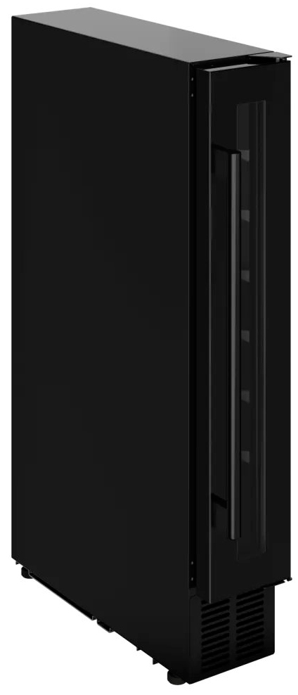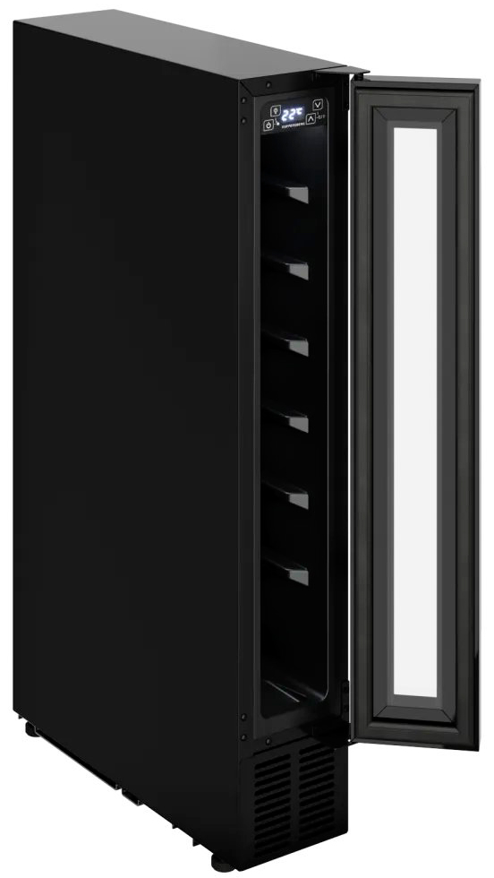 Встраиваемые холодильники для вина оснащаются специальной системой вентиляции: охлаждающая система у них находится в нижней части корпуса спереди. На такие устройства не навешивается мебельный фасад: дверца с затемненным стеклом остается на виду и открывается на достаточно широкий угол для свободного выдвижения деревянных полок.