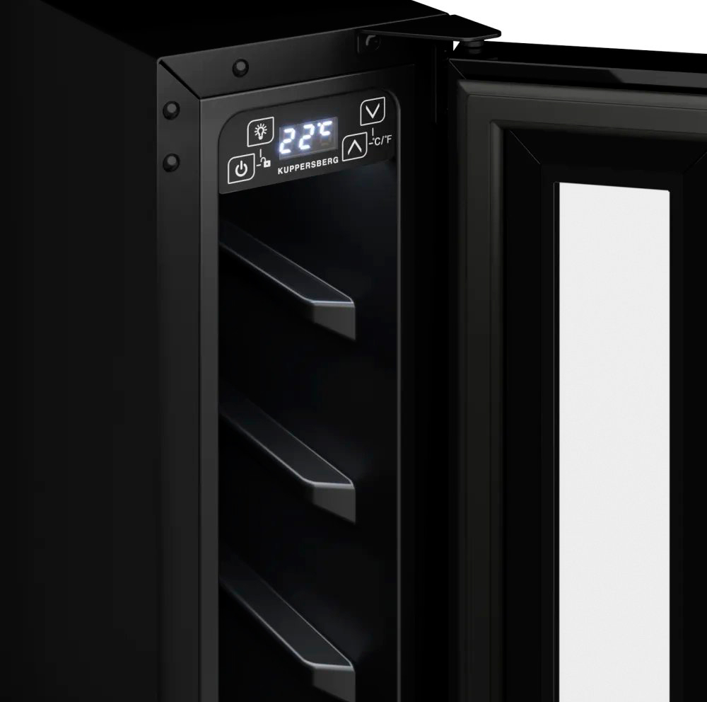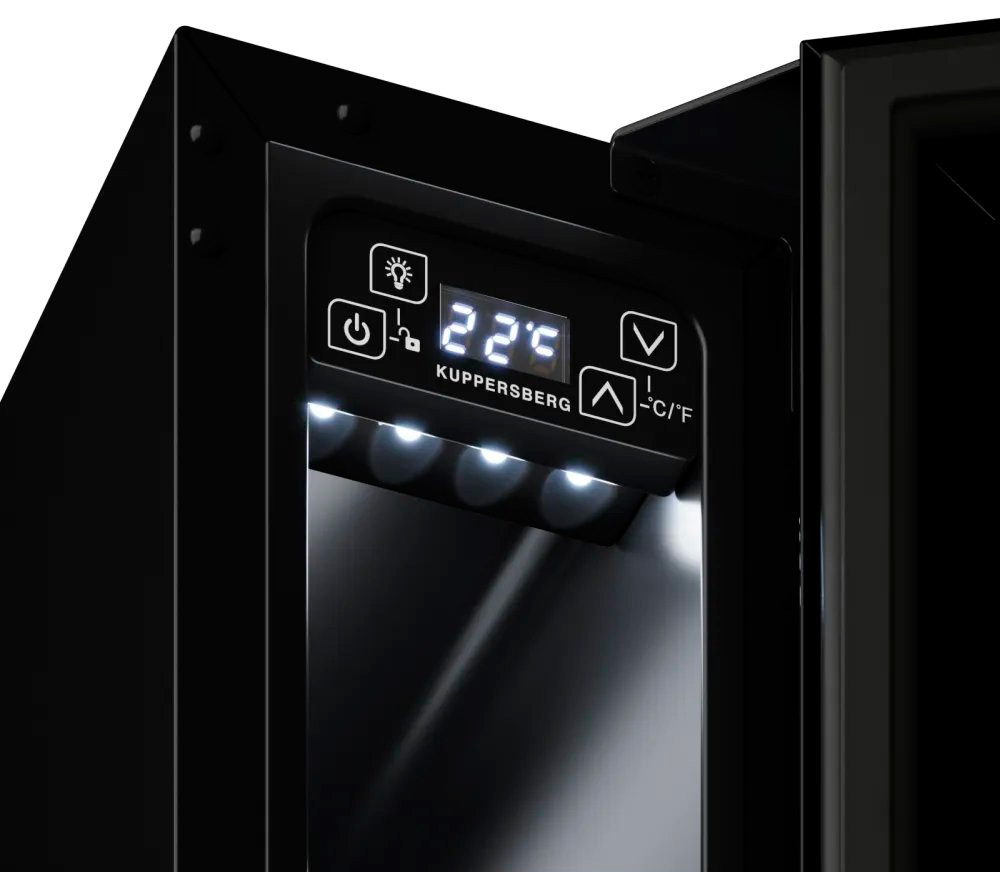 Большинство современных винных шкафов имеет электронное управление, они могут оснащаться обычными цифровыми дисплеями, на которых будет отображаться минимум информации — о включении, температуре в камере и возникших неисправностях. Однако в большинстве моделей используются текстовые сенсорные дисплеи из нескольких сегментов. С помощью кнопок сенсорного меню на этих дисплеях можно отображать и регулировать температуру в каждой зоне отдельно с точностью до градуса, выбирать уровень влажности, задавать дополнительные опции — отключение сигнализации, включение вентиляции и внутреннего освещения, активацию защиты от детей, тип отображения температуры ºF/ºC. Здесь же будут появляться коды ошибок, выданные системой обнаружения неисправностей.