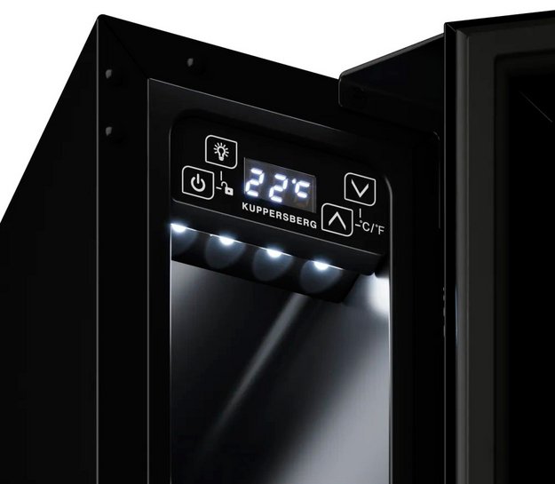 Современные винные шкафы всех типов, в том числе компрессорные, темоэлектрические и абсорбционные, оснащаются электронной системой управления — кнопочной или сенсорной. Панель управления, с помощью которой производится регулировка параметров работы, может размещаться внутри винного шкафа за дверцей или снаружи в верхней части корпуса. Второй вариант более удобен, поскольку для изменения параметров не нужно открывать дверцу. Кроме того, такое расположение панели управления позволяет поддерживать более стабильную температуру в камере. Однако для больших винных шкафов в классическом стиле из ценных пород дерева предпочтительнее скрытая панель управления, которая не портит их внешний вид.