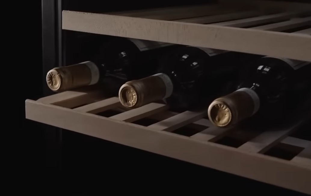 Полки из дерева — классический вариант интерьера винного шкафа, их надежность и удобство проверено веками. Современные стеллажи делают из разных пород, часто из массива (например, бука). Они стабильно выдерживают высокие нагрузки даже при максимальном количестве бутылок, хорошо переносят влажность свыше 60% и дополнительно скрадывают вибрации компрессора.