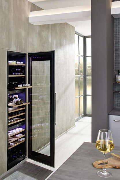 Встраиваемые холодильники для вина оснащаются специальной системой вентиляции: охлаждающая система у них находится в нижней части корпуса спереди. На такие устройства не навешивается мебельный фасад: дверца с затемненным стеклом остается на виду и открывается на достаточно широкий угол для свободного выдвижения деревянных полок.