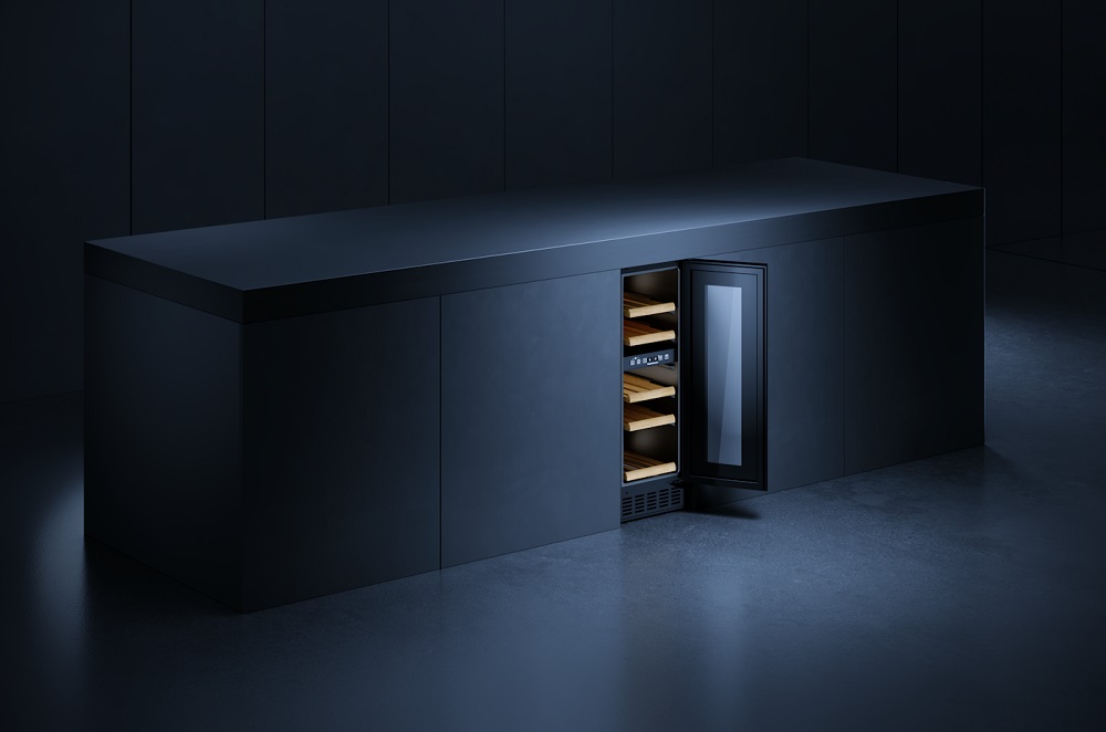Встраиваемые холодильники для вина оснащаются специальной системой вентиляции: охлаждающая система у них находится в нижней части корпуса спереди. На такие устройства не навешивается мебельный фасад: дверца с затемненным стеклом остается на виду и открывается на достаточно широкий угол для свободного выдвижения деревянных полок.
