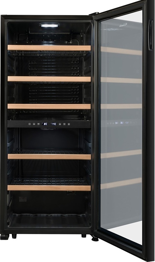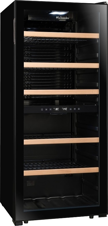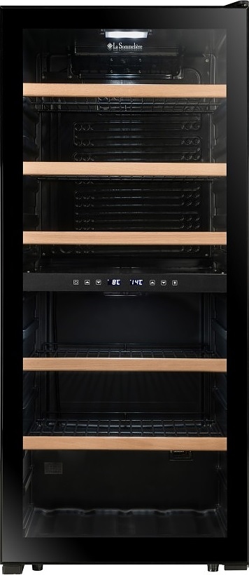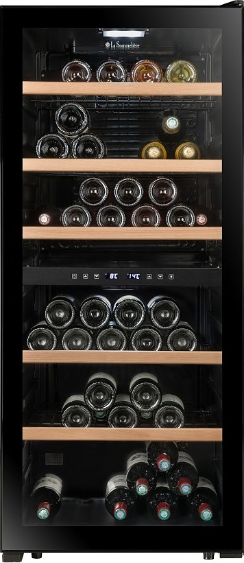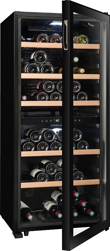 Винный холодильник La Sommeliere LS102DZBLACK имеет две температурные зоны, в которых одновременно можно хранить разные сорта алкоголя и выставлять разные сочетания настроек. Он устанавливается отдельно, что удобно, если у вас есть специальное помещение — кладовая, погреб и т.д. Количество бутылок, которое можно разместить с учетом полной комплектации и из расчета объема бутылки 0,75 л, — 102 шт.