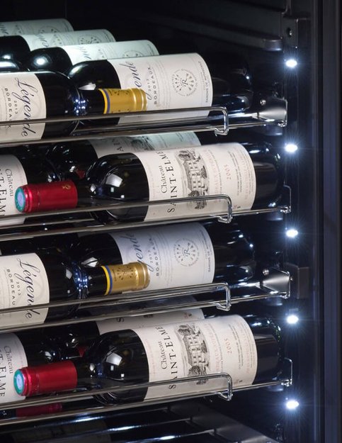 Кнопки для управления подсветкой выносятся на панель управления. Лампы синего, белого или голубого цветов могут располагаться в верхней части камеры или на боковых сторонах. Дополнительное освещение может устанавливаться в винных холодильниках с зоной для сервировки: она обеспечивает лучший обзор и доступ при подготовке вина к подаче.