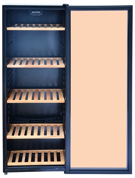Дверца у большинства винных шкафов изготавливается из многослойного тонированного стекла. Такой материал, с одной стороны, позволяет оценивать коллекцию вин визуально, не открывая дверцу, в условиях стабильной температуры и влажности. С другой стороны, затемненное стекло с УФ-фильтром в виде напыления или специальной пленки надежно изолирует винные бутылки негативного воздействия ультрафиолетового излучения. Несколько слоев стекла обеспечивают при этом дополнительную защиту. Очень часто стекло в дверце заключается в рамку из дерева или металла. Натуральный или окрашенный металл или дерево не только способствуют прочности конструкции, но и превращают винный холодильник, особенно отдельно стоящий, в эффектный элемент обстановки.