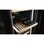Стеклянная дверь — дополнительный изящный штрих к общему дизайну модели. Специальное покрытие защищает вино от влияния ультрафиолетовых лучей, которые проникают, если шкаф находится в солнечной комнате. Цвет корпуса — черная сталь. Дверь можно перевесить на другую сторону, поэтому вариантов размещения его в доме становится больше. Доводчик делает открытие и закрытие плавным.