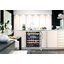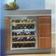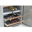 Встраиваемые холодильники для вина оснащаются специальной системой вентиляции: охлаждающая система у них находится в нижней части корпуса спереди. На такие устройства не навешивается мебельный фасад: дверца с затемненным стеклом остается на виду и открывается на достаточно широкий угол для свободного выдвижения деревянных полок.
