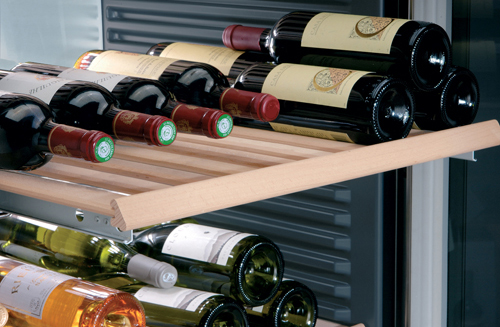 Полки в винных шкафах позволяют размещать бутылки для хранения в горизонтальном положении. Это необходимо, чтобы пробка постоянно смачивалась жидкостью и не пересыхала. Плотно закрытая пробка гарантирует, что внутрь бутылки не проникнет наружный воздух. Кислород, содержащийся в воздухе, может стать причиной ухудшения вкуса вина и даже его скисания. Кроме того, горизонтальное положение позволяет лучше оценить количество осадка. Материал изготовления полок выбирается, исходя из требований, предъявляемых к содержанию коллекции вин. Одним из основных требования является отсутствие или максимальное сокращение вибрации и хорошая фиксация бутылок на месте хранения. Даже если полка выдвигается, бутылки должны оставаться на своем месте. Второе требование исключает применение стеклянных полок, как в обычном холодильнике: на них почти невозможно зафиксировать бутылки.