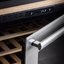 Дверца у большинства винных шкафов изготавливается из многослойного тонированного стекла. Такой материал, с одной стороны, позволяет оценивать коллекцию вин визуально, не открывая дверцу, в условиях стабильной температуры и влажности. С другой стороны, затемненное стекло с УФ-фильтром в виде напыления или специальной пленки надежно изолирует винные бутылки негативного воздействия ультрафиолетового излучения. Несколько слоев стекла обеспечивают при этом дополнительную защиту. Очень часто стекло в дверце заключается в рамку из дерева или металла. Натуральный или окрашенный металл или дерево не только способствуют прочности конструкции, но и превращают винный холодильник, особенно отдельно стоящий, в эффектный элемент обстановки.
