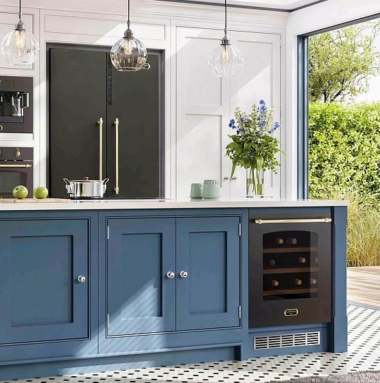 Встраиваемые холодильники для вина оснащаются специальной системой вентиляции: охлаждающая система у них находится в нижней части корпуса спереди. На такие устройства не навешивается мебельный фасад: дверца с затемненным стеклом остается на виду и открывается на достаточно широкий угол для свободного выдвижения деревянных полок.