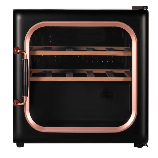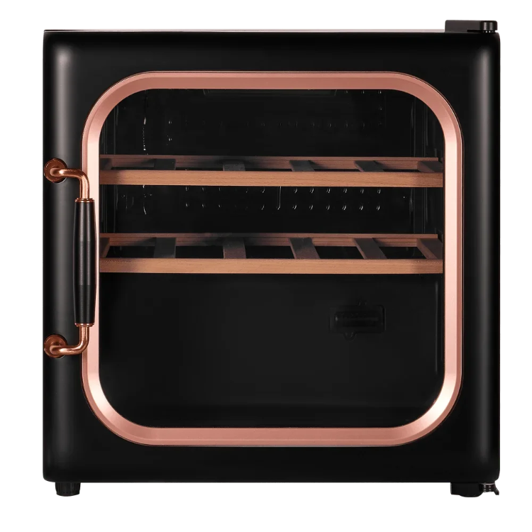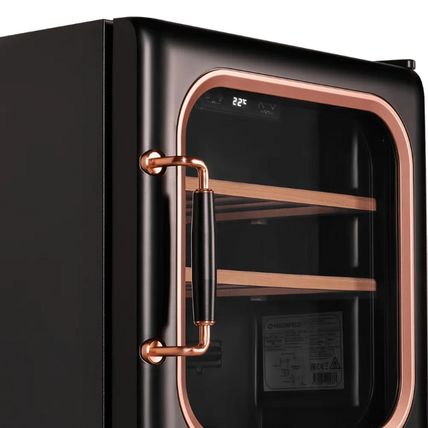 Стеклянная дверь — дополнительный изящный штрих к общему дизайну модели. Специальное покрытие защищает вино от влияния ультрафиолетовых лучей, которые проникают, если шкаф находится в солнечной комнате. Цвет корпуса — черный.