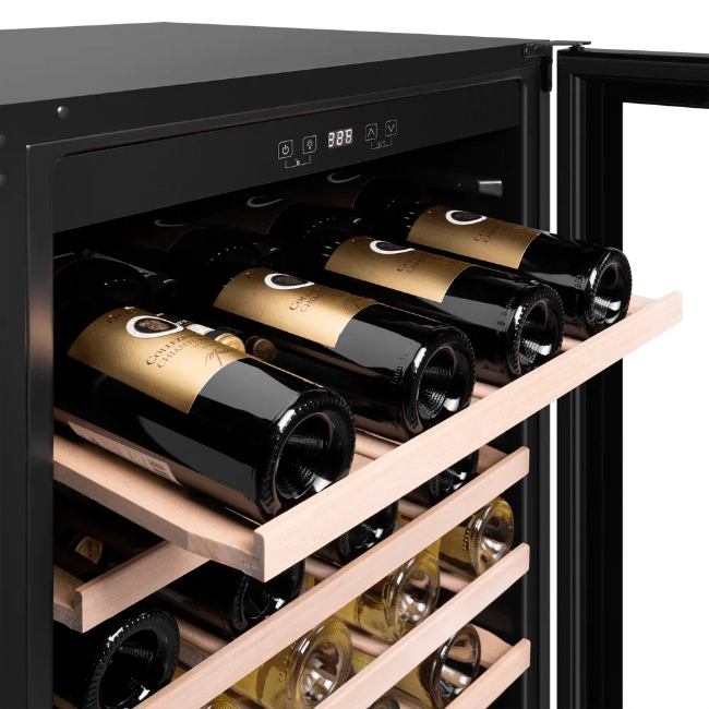 Стеклянная дверь — дополнительный изящный штрих к общему дизайну модели. Специальное покрытие защищает вино от влияния ультрафиолетовых лучей, которые проникают, если шкаф находится в солнечной комнате. Цвет корпуса — черный.