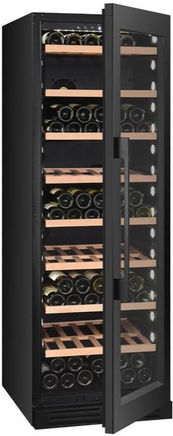 Электронное управление помогает быстро разобраться в том, как функционирует эта модель, и легко настроить все необходимые параметры. На дисплее отображаются данные, которые собирают датчики в камере. Лампочки, расположенные внутри, хорошо подсвечивают бутылки. Всего полок, на которых можно разместить коллекцию, в шкафу 15 шт. Пространство тщательно вентилируется, чтобы воздух не застаивался, не попадали посторонние запахи.