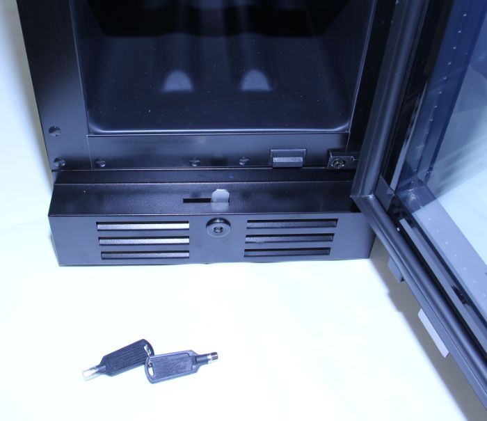 Замок в винных шкафах предназначается для предотвращения нежелательного доступа — в частности, для защиты винной коллекции от детей. Механический замок может располагаться на дверце, как у обычного шкафа или сейфа. Если же дверца холодильника полностью изготовлена из стекла, замок может находиться на цокольной решетке. Такие замки комплектуются набором ключей. Иногда на дверце устанавливаются электронные замки, открыть которые можно при помощи комбинации кнопок или при помощи чипа. Выбрать шкаф с замком можно как для установки в баре или кафе, так и для домашнего использования.