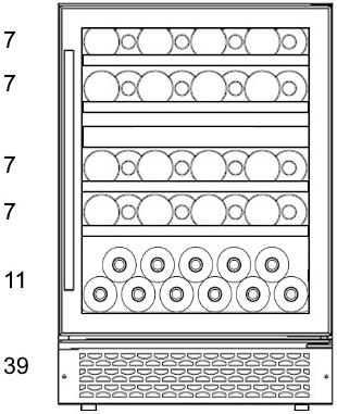 Стандартная вместительность рассчитывается по количеству бутылок «Бордо» 0,75 л. Это число также показывает максимальную загрузку при полной комплектации (полок, ящиков и других элементов).
