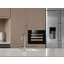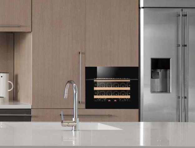 Встраиваемые холодильники для вина оснащаются специальной системой вентиляции: охлаждающая система у них находится в нижней части корпуса спереди. На такие устройства не навешивается мебельный фасад: дверца с затемненным стеклом остается на виду и открывается на достаточно широкий угол для свободного выдвижения деревянных полок.