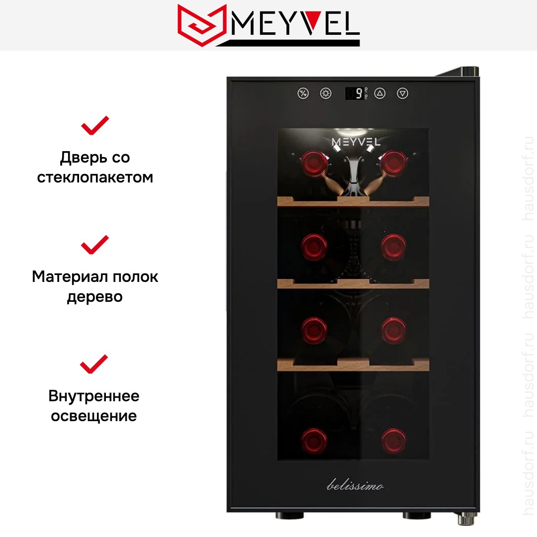 Винный холодильник Meyvel MV08-TBF1-Следующий имеет одну температурную зону, в которой можно разместить бутылки и единовременно выставить только одну комбинацию настроек. Он устанавливается отдельно, что удобно, если у вас есть специальное помещение — кладовая, погреб и т.д. Благодаря компактным размерам данная модель — отличный выбор для офиса, гостиничного номера. Количество бутылок, которое можно разместить с учетом полной комплектации и из расчета объема бутылки 0,75 л, — 8 шт.
