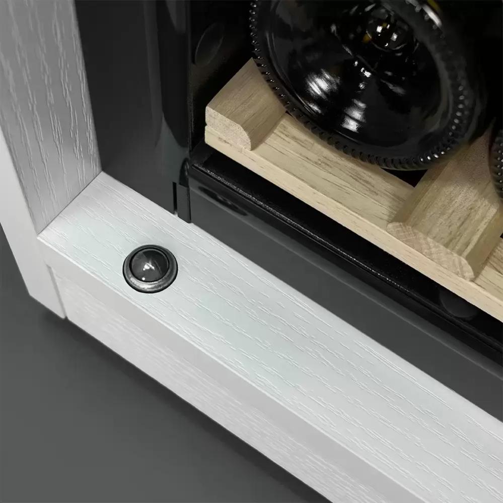 Стеклянная дверь — дополнительный изящный штрих к общему дизайну модели. Специальное покрытие защищает вино от влияния ультрафиолетовых лучей, которые проникают, если шкаф находится в солнечной комнате. Хранение становится еще безопаснее и герметичнее благодаря нескольким слоям стекол. Цвет корпуса — белый.