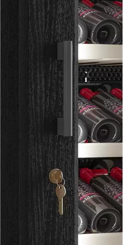 Замок в винных шкафах предназначается для предотвращения нежелательного доступа — в частности, для защиты винной коллекции от детей. Механический замок может располагаться на дверце, как у обычного шкафа или сейфа. Если же дверца холодильника полностью изготовлена из стекла, замок может находиться на цокольной решетке. Такие замки комплектуются набором ключей. Иногда на дверце устанавливаются электронные замки, открыть которые можно при помощи комбинации кнопок или при помощи чипа. Выбрать шкаф с замком можно как для установки в баре или кафе, так и для домашнего использования.