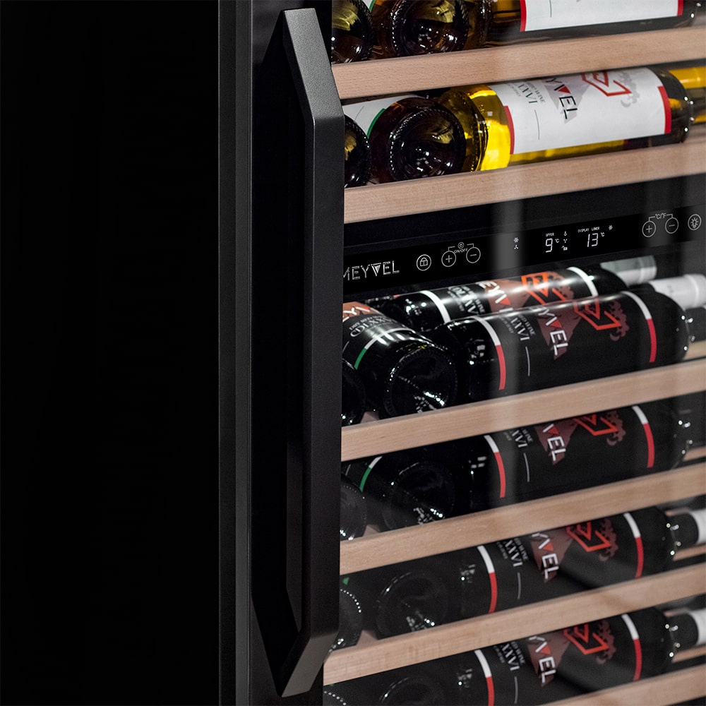 Для длительного сохранения установленных параметров в винных шкафах Meyvel используется дверца с многослойным остеклением. Такое решение позволяет удерживать холод внутри камеры вне зависимости от температуры в помещении, а также сохранить температуру при отключении электроэнергии.