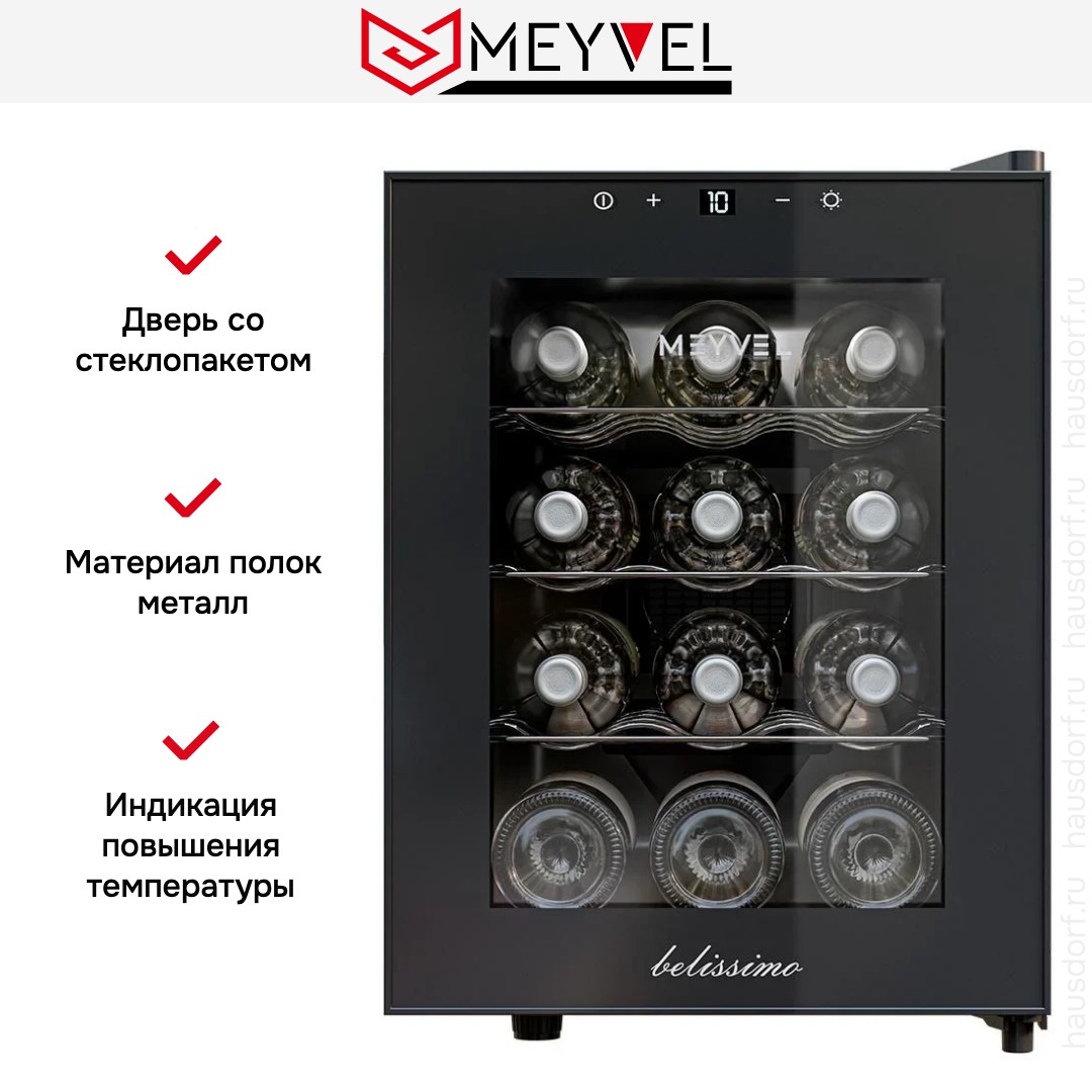 Для длительного сохранения установленных параметров в винных шкафах Meyvel используется дверца с многослойным остеклением. Такое решение позволяет удерживать холод внутри камеры вне зависимости от температуры в помещении, а также сохранить температуру при отключении электроэнергии.