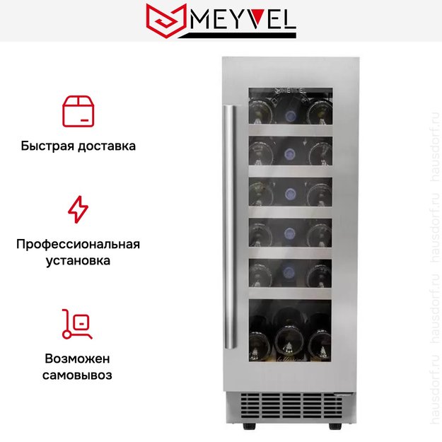 Для длительного сохранения установленных параметров в винных шкафах Meyvel используется дверца с многослойным остеклением. Такое решение позволяет удерживать холод внутри камеры вне зависимости от температуры в помещении, а также сохранить температуру при отключении электроэнергии.