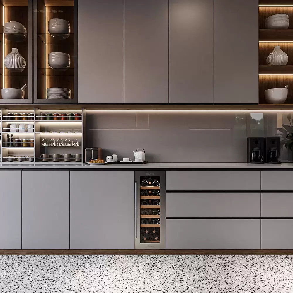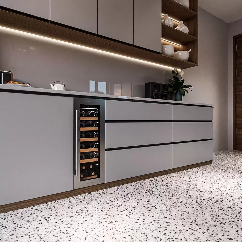 Частичное встраивание отдельно стоящих винных шкафов в нишу — полезная опция, позволяющая сэкономить место в помещении и выбрать лучшее расположение прибора. Устанавливать в нишу или под столешницу рекомендуется только компрессорные модели — другие, например, термоэлектрические, не смогут достаточно вентилироваться при таком расположении. Если винный холодильник оснащен воздухозаборными решетками и радиатором охлаждения в нижней части, он может быть встроен без зазоров. Для удаления нагретого воздуха требуется свободный проход по всей длине холодильника от цоколя до верхней части.