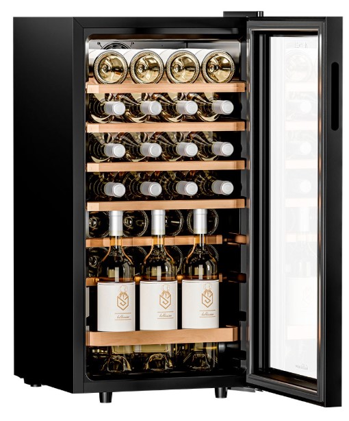 Стеклянная дверь — дополнительный изящный штрих к общему дизайну модели. Специальное покрытие защищает вино от влияния ультрафиолетовых лучей, которые проникают, если шкаф находится в солнечной комнате. Хранение становится еще безопаснее и герметичнее благодаря нескольким слоям стекол. Цвет корпуса — черный.