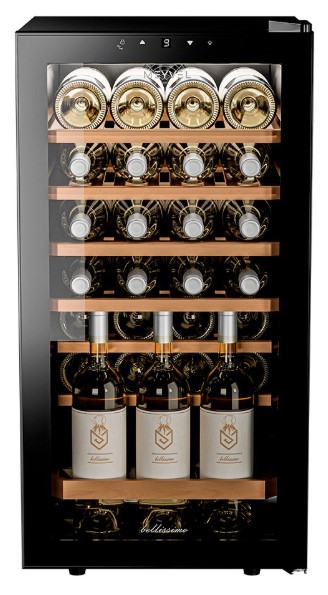 Электронное управление помогает быстро разобраться в том, как функционирует эта модель, и легко настроить все необходимые параметры. На дисплее отображаются данные, которые собирают датчики в камере. Лампочки, расположенные внутри, хорошо подсвечивают бутылки. Всего полок, на которых можно разместить коллекцию, в шкафу 6 шт.