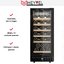 Монотемпературный шкаф с одной камерой работает на компрессорном охлаждении с динамической циркуляцией воздуха и автоматическим размораживанием. Диапазон настройки температуры лежит между +5 и +18 °C при относительной влажности 60-80%, что подходит для выдержки и краткосрочного хранения. Общий объём 85 л позволяет разместить до 31 бутылки по 0.75 л. Управление сенсорное, с цифровым термометром и индикацией повышения температуры; внутреннее освещение и вентиляция облегчают контроль состояния. Есть угольный фильтр и резервуар для воды для поддержания микроклимата, замок обеспечивает безопасность. Аппарат питается от сети 220-240 В, имеет мощность 90 Вт, уровень шума 41 дБ и класс энергопотребления A.
