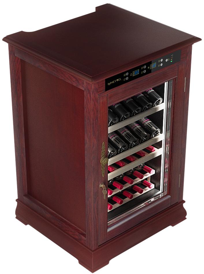 Винный шкаф Meyvel MV46-WM1-C компактного размера представлен в классическом дизайне. Стальной корпус обшит деревом в цвете махагон. Данная модель будет дополнять интерьер или становится его акцентным решением. Устройство предусматривает одну температурную зону. Пользователь может выставить на электронной панели управления не только температурные значения, но и влажность, что позволяет обеспечить наилучшие результаты хранения. Дверца легко открывается при помощи накладной ручки. Двойное стекло и специальная тонировка препятствуют попаданию ультрафиолетового излучения, которое пагубно воздействует на вино. Изделие характеризуется очень тихой работой, поэтому его можно установить в помещение со спальным местом — максимальный уровень шума винного шкафа Мейвел MV46-WM1-C составляет всего 38 дБ.