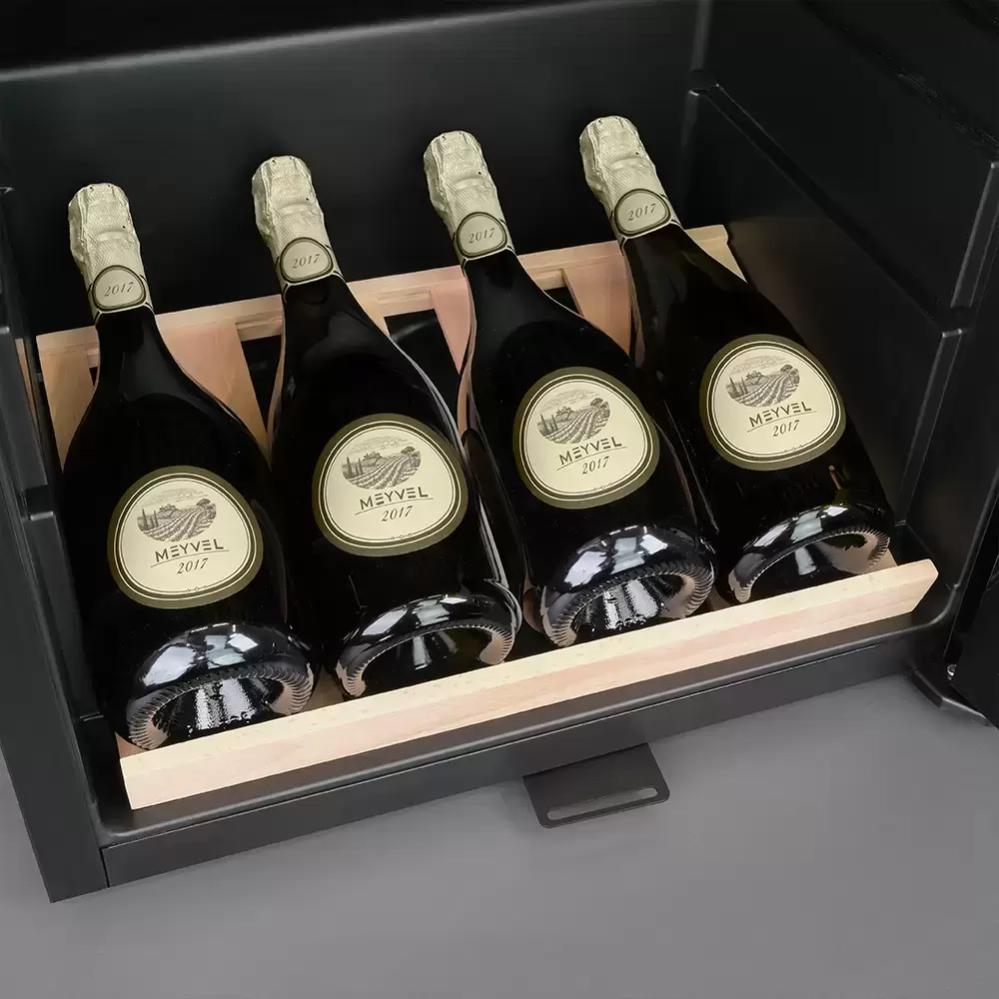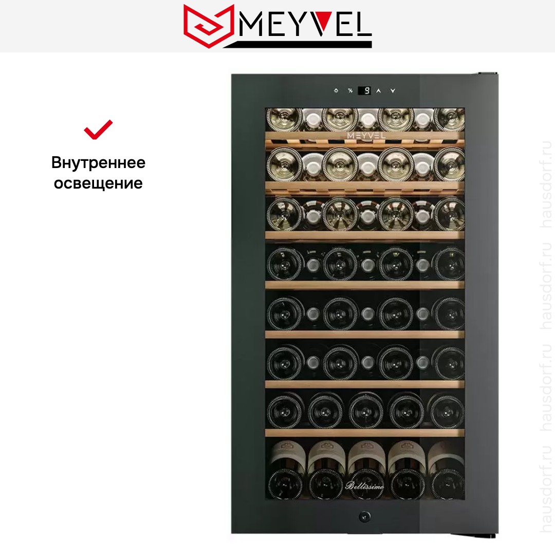 Винный холодильник Meyvel MV52-KBF1 имеет одну температурную зону, в которой можно разместить бутылки и единовременно выставить только одну комбинацию настроек. Он устанавливается отдельно, что удобно, если у вас есть специальное помещение — кладовая, погреб и т.д. Благодаря компактным размерам данная модель — отличный выбор для офиса, гостиничного номера. Количество бутылок, которое можно разместить с учетом полной комплектации и из расчета объема бутылки 0,75 л, — 52 шт.