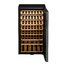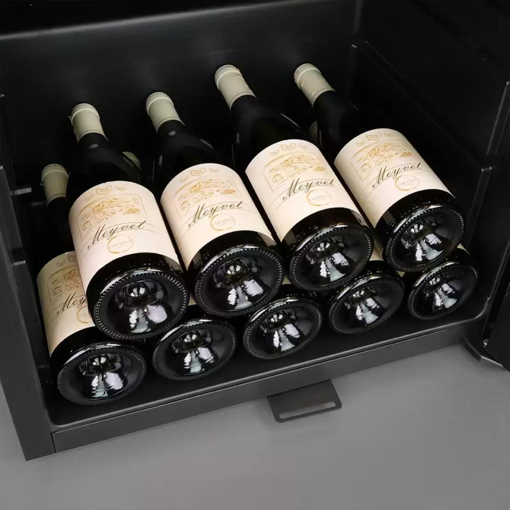 Стеклянная дверь — дополнительный изящный штрих к общему дизайну модели. Специальное покрытие защищает вино от влияния ультрафиолетовых лучей, которые проникают, если шкаф находится в солнечной комнате. Хранение становится еще безопаснее и герметичнее благодаря нескольким слоям стекол. Цвет корпуса — черный.