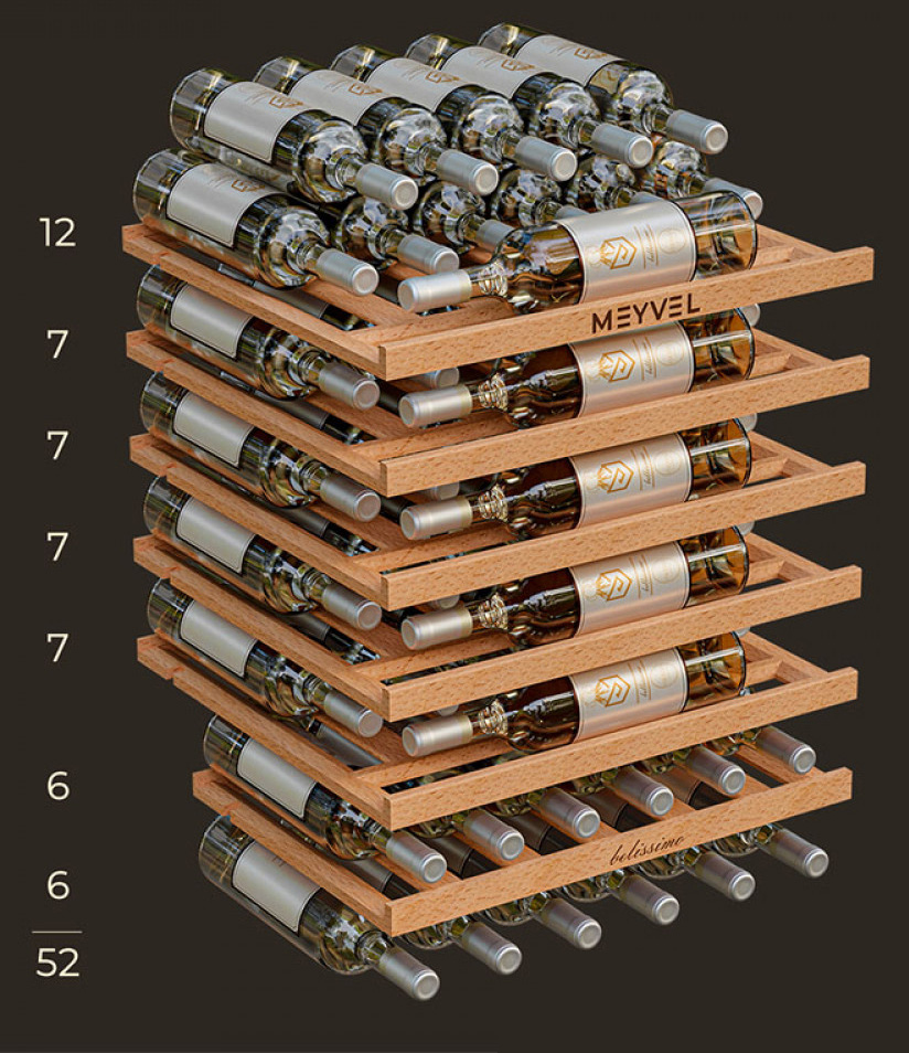 Предусмотренная система вентиляции винных шкафов Meyvel позволяет принудительно циркулировать потоки воздуха. Благодаря этому даже заполненных холодильник не образует зон с повышенной температурой, смешивая потоки и равномерно распределяя их по пространству.