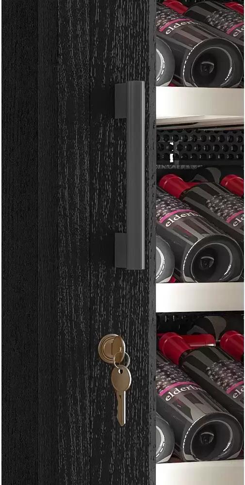 Стеклянная дверь — дополнительный изящный штрих к общему дизайну модели. Специальное покрытие защищает вино от влияния ультрафиолетовых лучей, которые проникают, если шкаф находится в солнечной комнате. Хранение становится еще безопаснее и герметичнее благодаря нескольким слоям стекол. Цвет корпуса — черный.