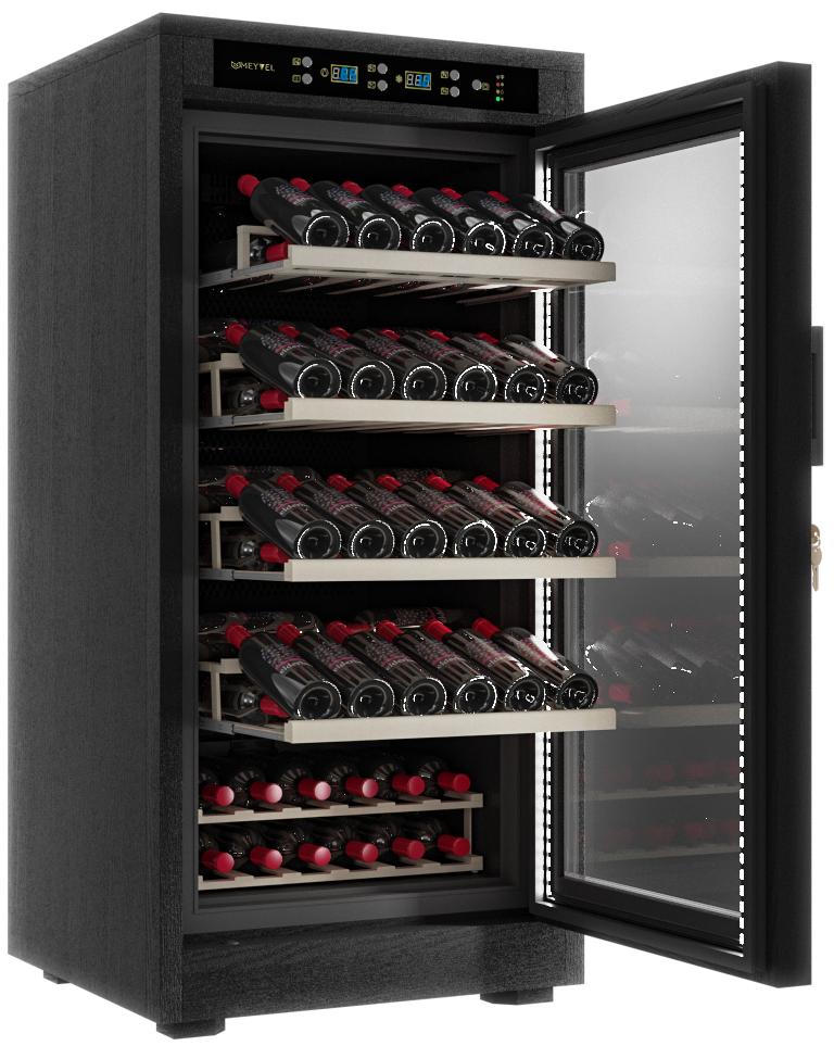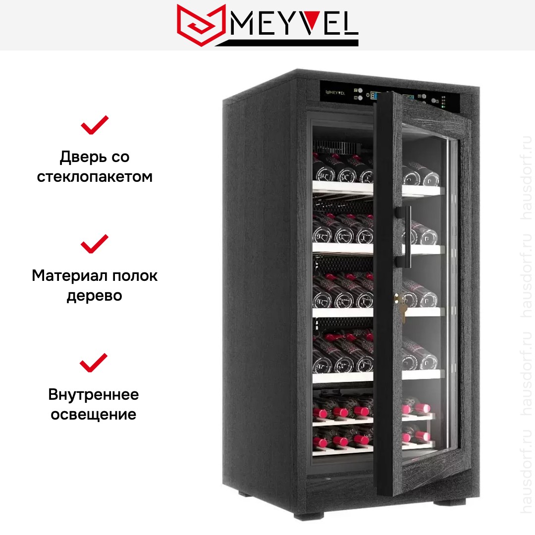 Винный холодильник Meyvel MV66-WB1-M имеет одну температурную зону, в которой можно разместить бутылки и единовременно выставить только одну комбинацию настроек. Он устанавливается отдельно, что удобно, если у вас есть специальное помещение — кладовая, погреб и т.д. Количество бутылок, которое можно разместить с учетом полной комплектации и из расчета объема бутылки 0,75 л, — 66 шт.