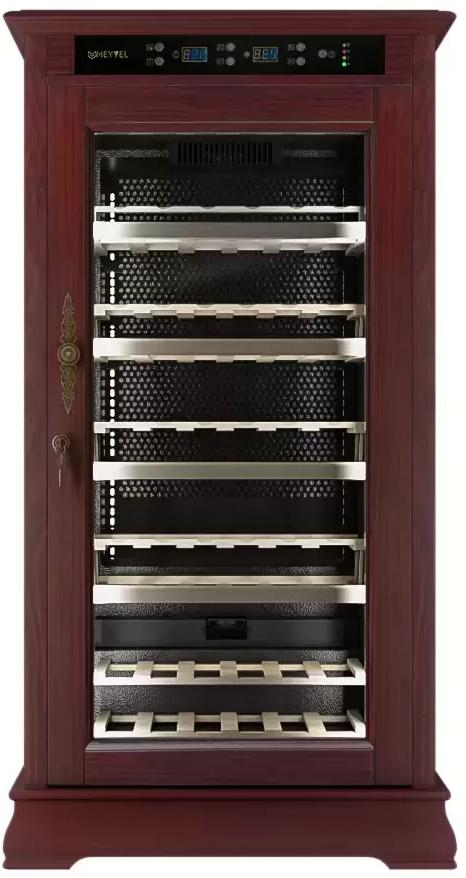Винный шкаф Meyvel MV66-WM1-C представлен в элегантном исполнении, которое будет актуально для классических интерьеров или дизайнов в стиле ретро. Модель в металлическом корпусе обшита качественным деревом в цвете махагон. Полки выполнены из массива бука — отличаются гладкостью, прочностью и долговечностью использования. Дверь со стеклопакетом и защитой от ультрафиолетового излучения. Это важно, так как при хранении винных напитков его воздействие может действовать пагубно. Управлять прибором легко и просто с сенсорной панели. Кнопки имеют графические обозначения, что позволяет быстро сориентироваться в настройках. Светодиодное освещение в винном шкафу Мейвел MV66-WM1-C — экономичный вариант. Лампы не нагреваются во время работы и характеризуются длительным сроком службы. Тихая работа — еще одно преимущество устройства.