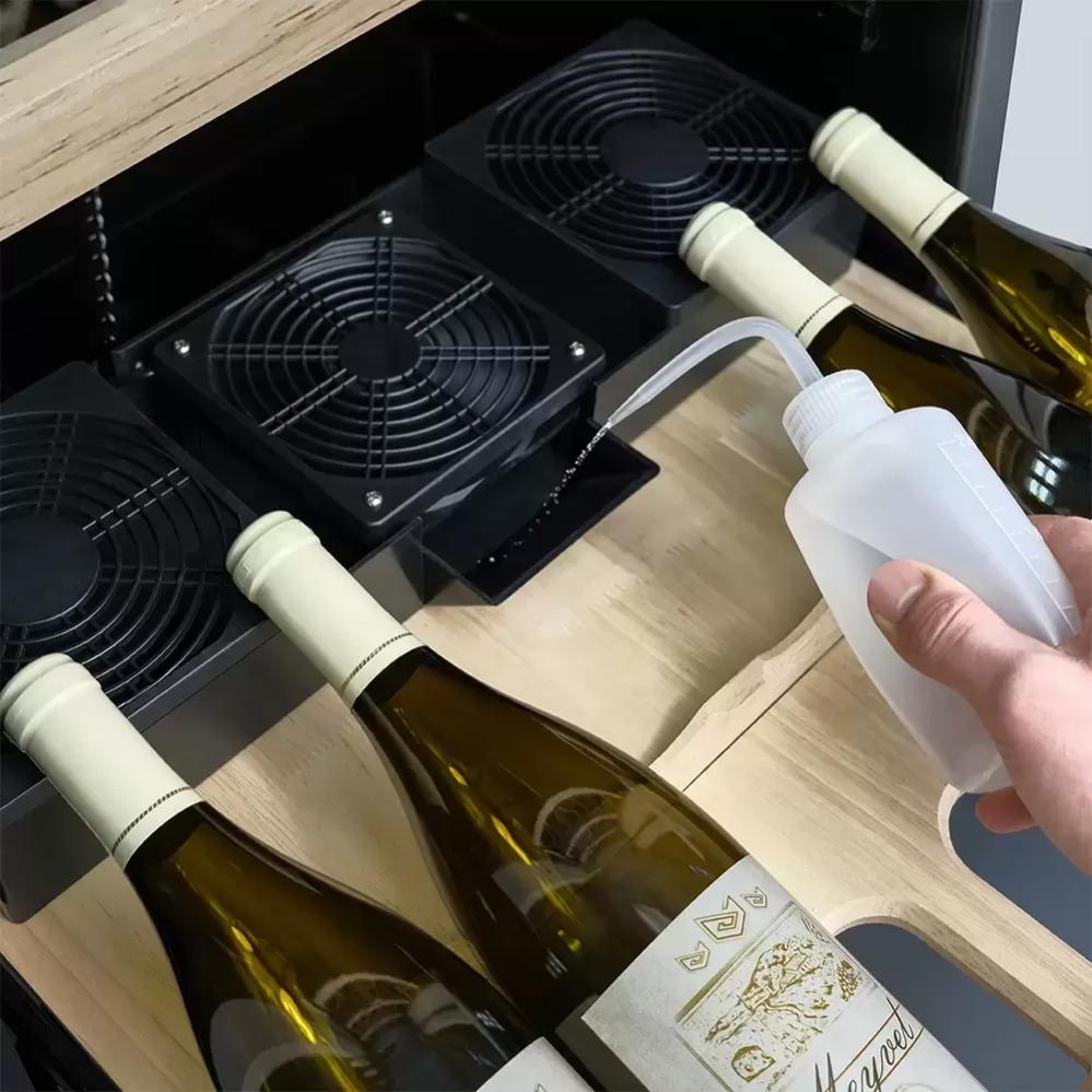Оптимальный уровень влажности в винном шкафу составляет от 50 до 75%. Показатели ниже 50% и выше 80% считаются опасными для коллекции вин. Не выйти за пределы допустимых значений поможет регулировка уровня влажности, которая производится вручную или автоматически. В ряде моделей для увеличения влажности используются резервуары с водой. В другом варианте используется натуральный лавовый камень, который помещают в лоток для сбора конденсата. Камень впитывает воду, а потом она медленно испаряется, увеличивая уровень влажности.
