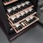 Стеклянная дверь — дополнительный изящный штрих к общему дизайну модели. Специальное покрытие защищает вино от влияния ультрафиолетовых лучей, которые проникают, если шкаф находится в солнечной комнате. Хранение становится еще безопаснее и герметичнее благодаря нескольким слоям стекол. Цвет корпуса — темный шоколад.
