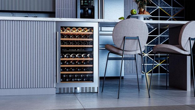 Частичное встраивание отдельно стоящих винных шкафов в нишу — полезная опция, позволяющая сэкономить место в помещении и выбрать лучшее расположение прибора. Устанавливать в нишу или под столешницу рекомендуется только компрессорные модели — другие, например, термоэлектрические, не смогут достаточно вентилироваться при таком расположении. Если винный холодильник оснащен воздухозаборными решетками и радиатором охлаждения в нижней части, он может быть встроен без зазоров. Для удаления нагретого воздуха требуется свободный проход по всей длине холодильника от цоколя до верхней части.