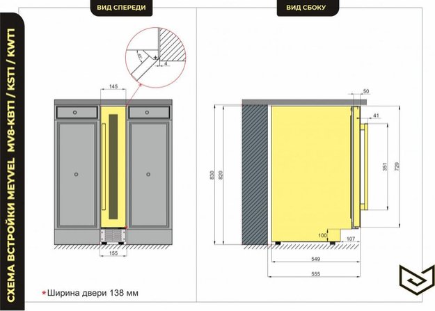 Частичное встраивание отдельно стоящих винных шкафов в нишу — полезная опция, позволяющая сэкономить место в помещении и выбрать лучшее расположение прибора. Устанавливать в нишу или под столешницу рекомендуется только компрессорные модели — другие, например, термоэлектрические, не смогут достаточно вентилироваться при таком расположении. Если винный холодильник оснащен воздухозаборными решетками и радиатором охлаждения в нижней части, он может быть встроен без зазоров. Для удаления нагретого воздуха требуется свободный проход по всей длине холодильника от цоколя до верхней части.