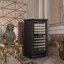 Стеклянная дверь — дополнительный изящный штрих к общему дизайну модели. Специальное покрытие защищает вино от влияния ультрафиолетовых лучей, которые проникают, если шкаф находится в солнечной комнате. Хранение становится еще безопаснее и герметичнее благодаря нескольким слоям стекол. Цвет корпуса — темный шоколад.