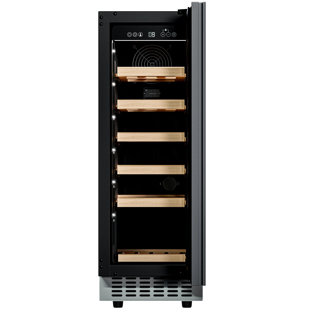 Современные винные шкафы всех типов, в том числе компрессорные, темоэлектрические и абсорбционные, оснащаются электронной системой управления — кнопочной или сенсорной. Панель управления, с помощью которой производится регулировка параметров работы, может размещаться внутри винного шкафа за дверцей или снаружи в верхней части корпуса. Второй вариант более удобен, поскольку для изменения параметров не нужно открывать дверцу. Кроме того, такое расположение панели управления позволяет поддерживать более стабильную температуру в камере. Однако для больших винных шкафов в классическом стиле из ценных пород дерева предпочтительнее скрытая панель управления, которая не портит их внешний вид.