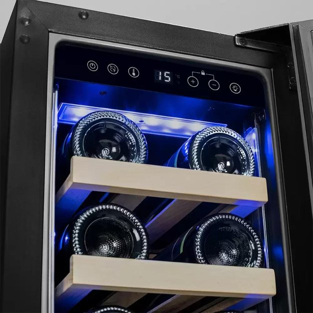 Большинство современных винных шкафов имеет электронное управление, они могут оснащаться обычными цифровыми дисплеями, на которых будет отображаться минимум информации — о включении, температуре в камере и возникших неисправностях. Однако в большинстве моделей используются текстовые сенсорные дисплеи из нескольких сегментов. С помощью кнопок сенсорного меню на этих дисплеях можно отображать и регулировать температуру в каждой зоне отдельно с точностью до градуса, выбирать уровень влажности, задавать дополнительные опции — отключение сигнализации, включение вентиляции и внутреннего освещения, активацию защиты от детей, тип отображения температуры ºF/ºC. Здесь же будут появляться коды ошибок, выданные системой обнаружения неисправностей.