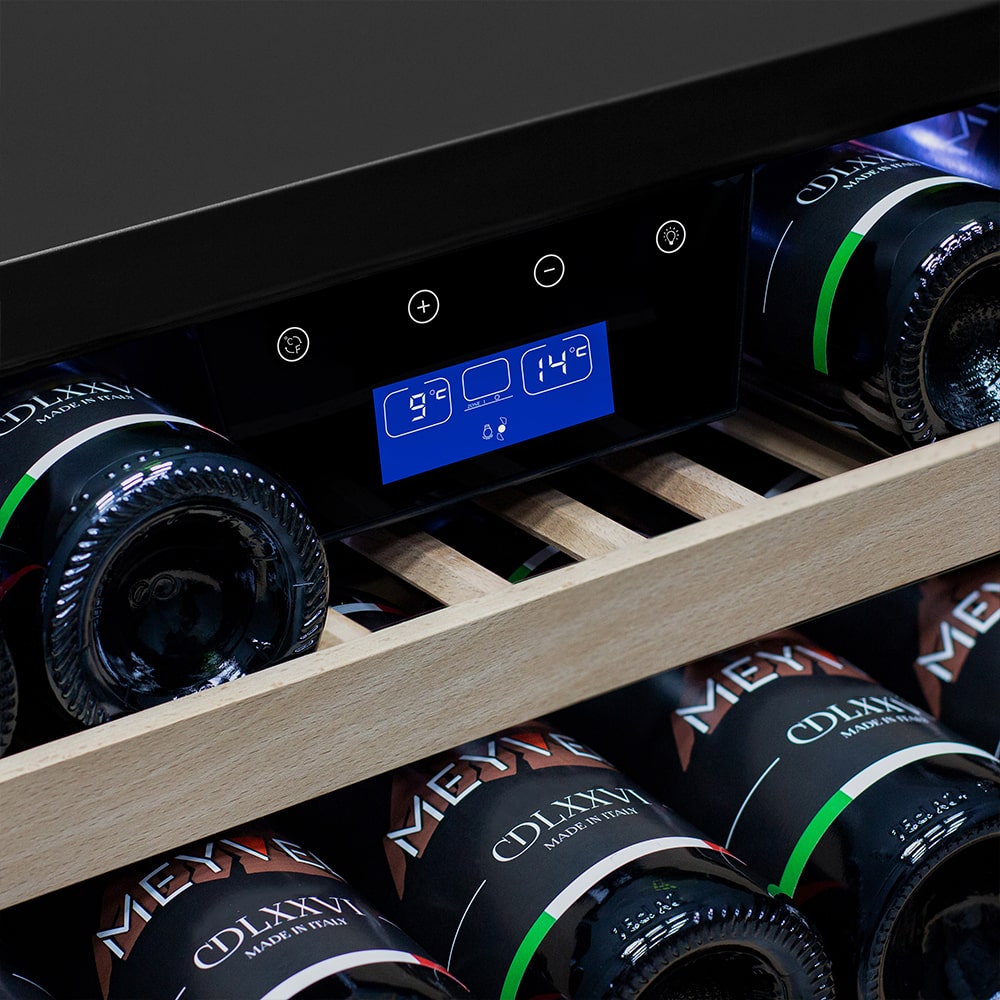 Большинство современных винных шкафов имеет электронное управление, они могут оснащаться обычными цифровыми дисплеями, на которых будет отображаться минимум информации — о включении, температуре в камере и возникших неисправностях. Однако в большинстве моделей используются текстовые сенсорные дисплеи из нескольких сегментов. С помощью кнопок сенсорного меню на этих дисплеях можно отображать и регулировать температуру в каждой зоне отдельно с точностью до градуса, выбирать уровень влажности, задавать дополнительные опции — отключение сигнализации, включение вентиляции и внутреннего освещения, активацию защиты от детей, тип отображения температуры ºF/ºC. Здесь же будут появляться коды ошибок, выданные системой обнаружения неисправностей.