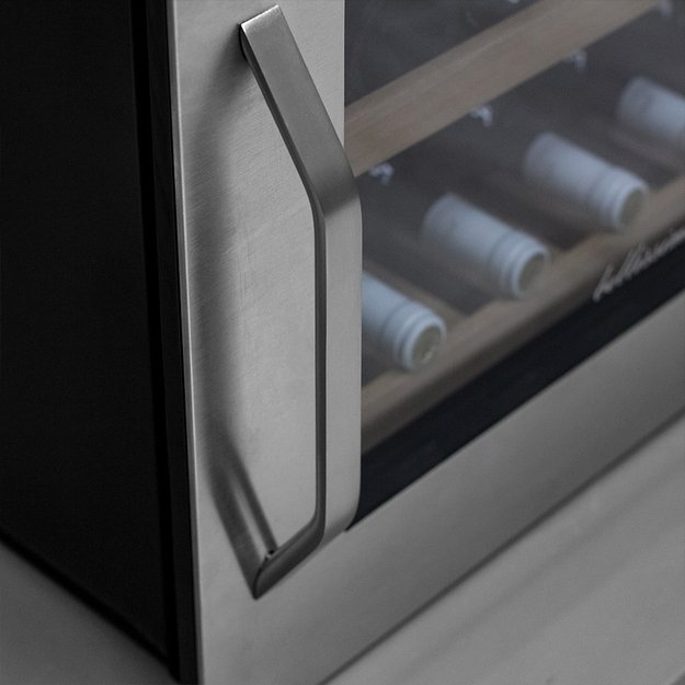 Вид и расположение ручки на дверце винного шкафа зависит прежде всего от дизайна и стиля изделия. В классических холодильниках со корпусом из дерева чаще всего используется внешняя ручка «под старину», изготовленная из металла — например, латуни, под бронзу или медь. Модели в современном стиле оснащаются внешними ручками из металла, выполненными в минималистическом стиле, или скрытыми ручками, создающими снаружи гладкую поверхность, за которой легко ухаживать. Некоторые производители предлагают винные шкафы без ручек: дверца у них открывается нажатием на среднюю или верхнюю часть.