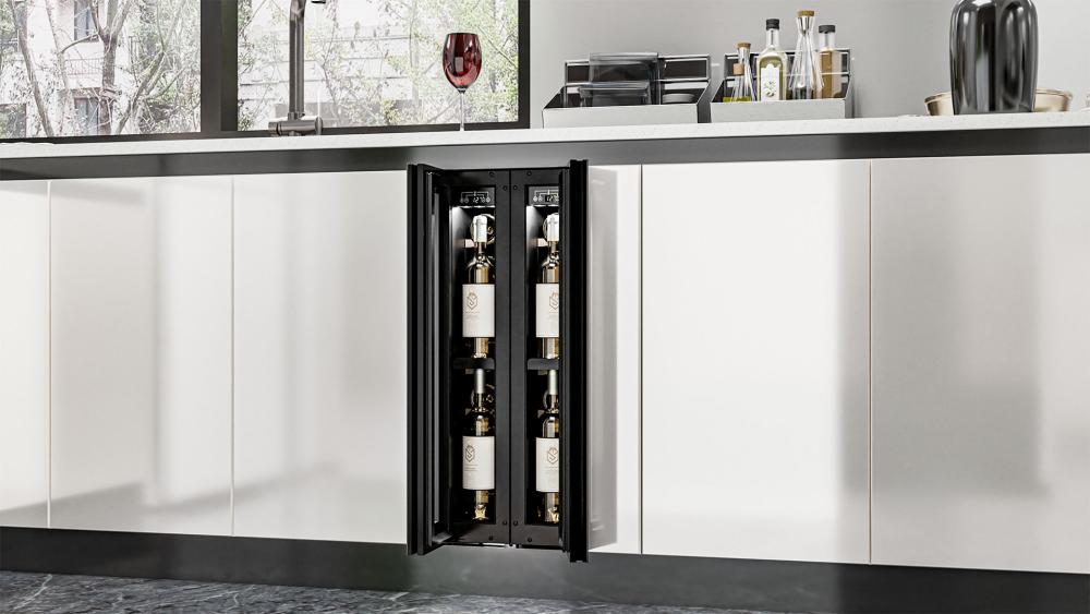 Встраиваемые холодильники для вина оснащаются специальной системой вентиляции: охлаждающая система у них находится в нижней части корпуса спереди. На такие устройства не навешивается мебельный фасад: дверца с затемненным стеклом остается на виду и открывается на достаточно широкий угол для свободного выдвижения деревянных полок.